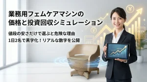 業務用フェムケアマシン(骨盤底筋チェア)の価格相場は?激安マシンと正規品の違い、月々のリース料金、損益分岐点を徹底解説。ジェル不要でランニングコスト0円の「ペルーナ」なら、1日2名の集客で黒字化が可能。投資回収のリアルな数字を公開。