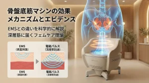 骨盤底筋トレーニングマシン(電磁パルス方式)の効果メカニズムを専門的に解説。なぜ服を着たまま深層筋に届くのか?EMSとの決定的な違いや、産後ケア・尿漏れ対策におけるエビデンス、顧客満足度を高めるための説明トークも紹介。